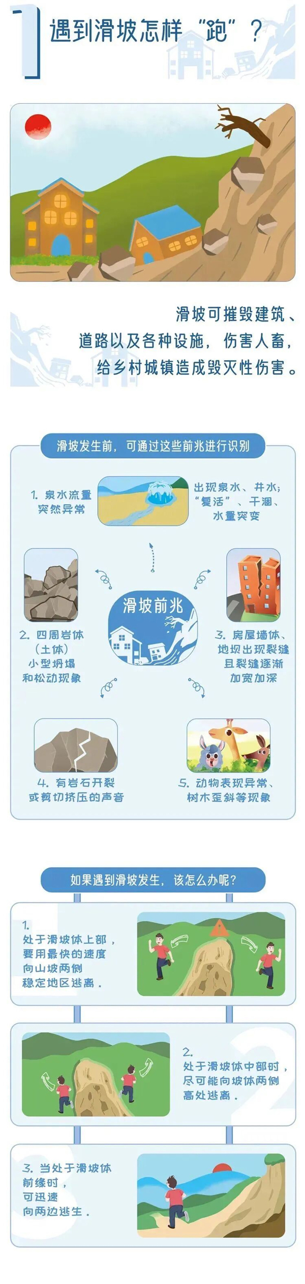 滑坡前兆 :在斜坡上不時有巖石掉落,出現新的裂縫;斜坡上的電線桿、樹木、籬笆等突然傾斜;地下傳來異常響聲,類似石頭碰撞、樹木折斷的聲音。