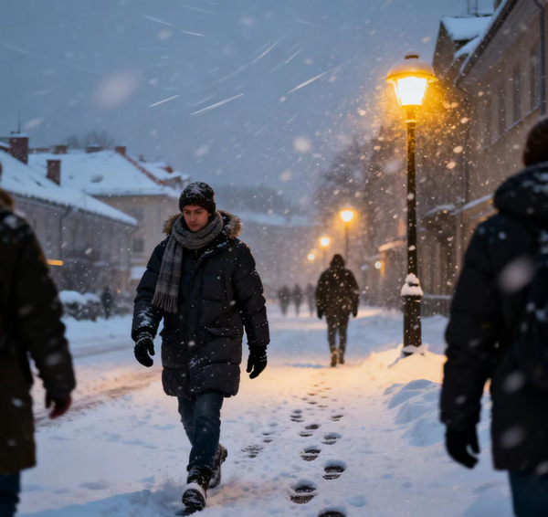 穩(wěn)字當(dāng)先 :雪天步行時(shí),務(wù)必穿上防滑鞋,過馬路前要仔細(xì)觀察路況車情,確認(rèn)安全后再通過。行走時(shí),身體稍微前傾,像企鵝一樣邁著小碎步,這樣能降低重心,保持身體平衡,避免摔倒。總之,寧可耽誤點(diǎn)時(shí)間,也千萬別在濕滑的路面上疾行奔跑。